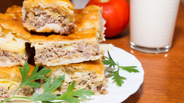 Баницата може да се направи с кори по избор, с телешка кайма, лук и доматено пюре.